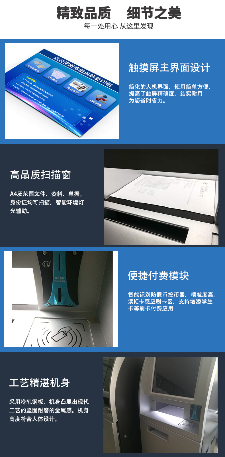 自助打印一體機的支付方式有:刷卡自助支付/微信支付/支付寶支付/投幣支付
