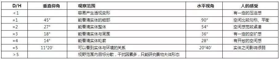 景區(qū)拍照抓拍系統(tǒng)怎么放置?首先考慮景點(diǎn)與游客視線的關(guān)系,這種關(guān)系取決于視線距離和物體高度之比(D/H),一般來說D/H大體在1:3之間,游客視線設(shè)計(jì)取垂直視角18°,水平視角36°。作為普通觀光時(shí),這個(gè)角度是視覺開始渙散的界線,這種距離會(huì)使游客去注意到與周邊物體的關(guān)系。當(dāng)視角為45°時(shí),注意力會(huì)相對(duì)集中,這時(shí)候游客容易觀察到周邊景物的細(xì)部。當(dāng)視角為30°時(shí)候,游客容易看到景物立面的細(xì)部。當(dāng)視角為14°時(shí),游客傾向于將景物看成突出于整體背景中的輪廓線(圖2,表1)。
