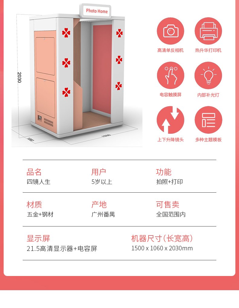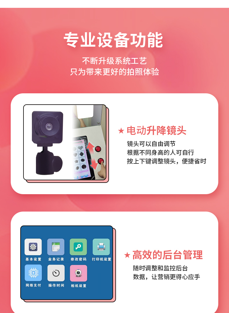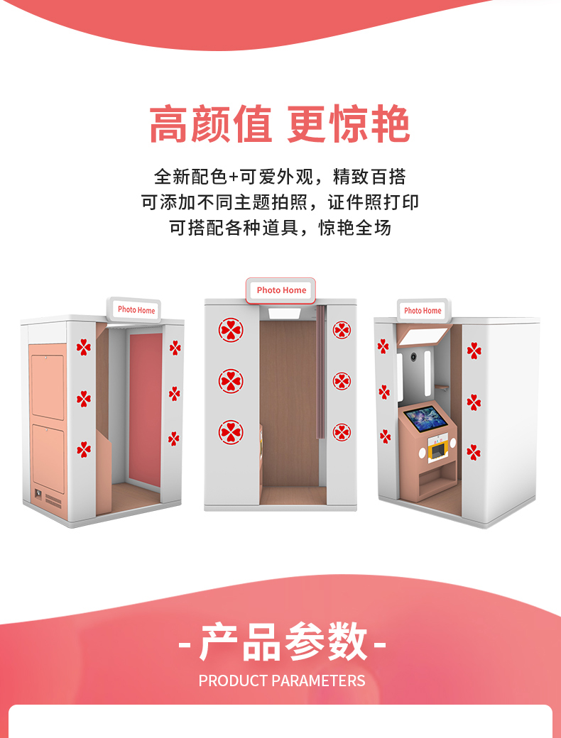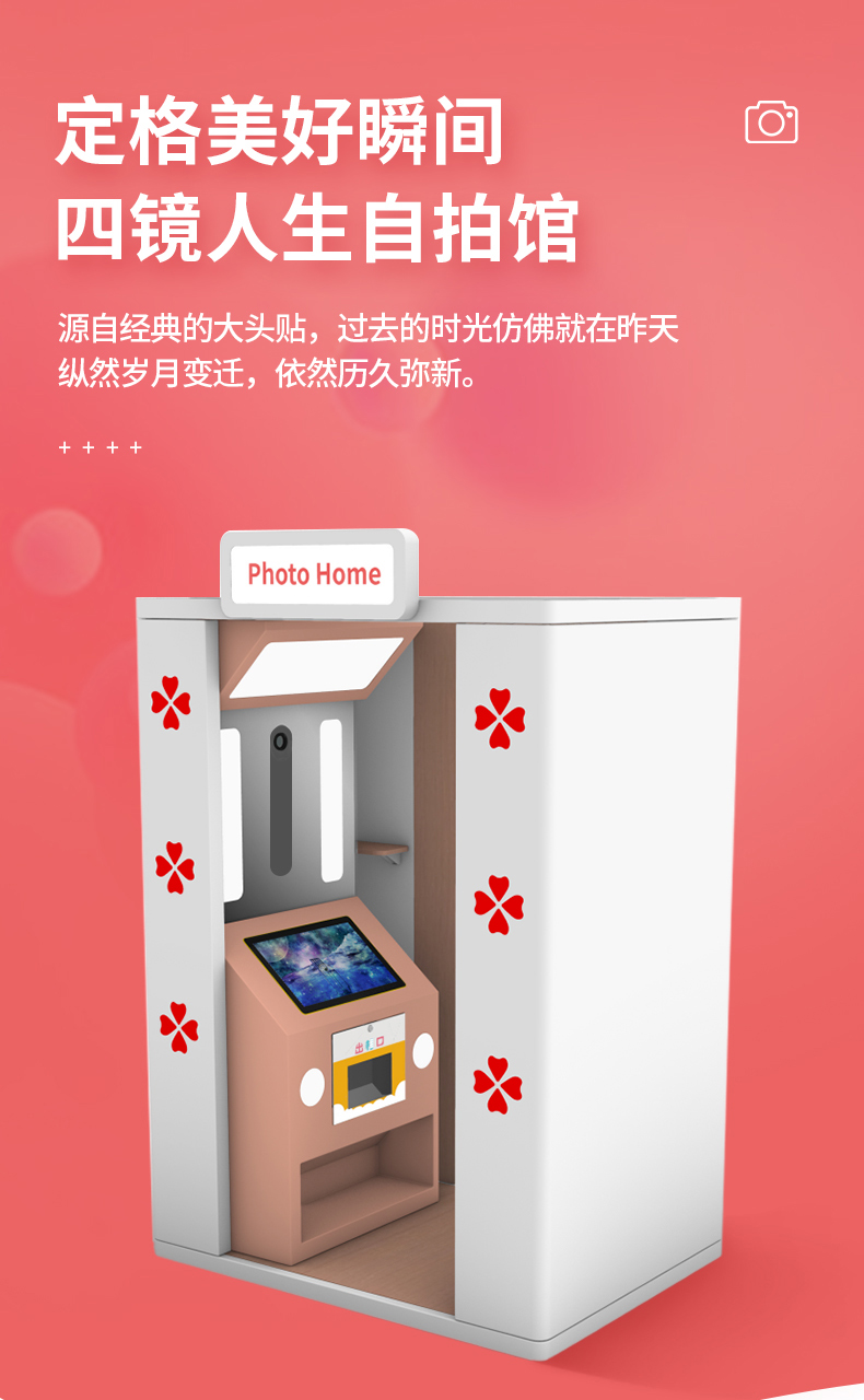 產(chǎn)品特點:這款大頭貼自拍機(jī)可電動升降鏡頭,滿足不同身高需求的人可直接按鍵上下移動鏡頭,非常的便捷智能化,并且軟件上更是加了AI寫真的功能,有趣好玩的拍照屋投放地點建議在年輕人密集的商場、電玩城、網(wǎng)紅店鋪等有消費(fèi)力的場地建議投放一臺至兩臺機(jī)器以上。